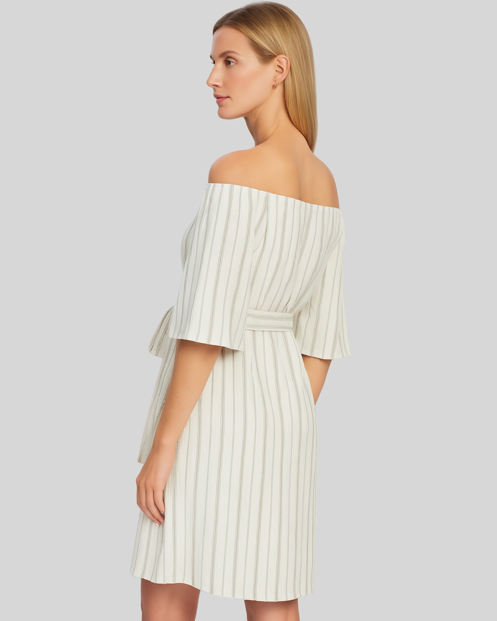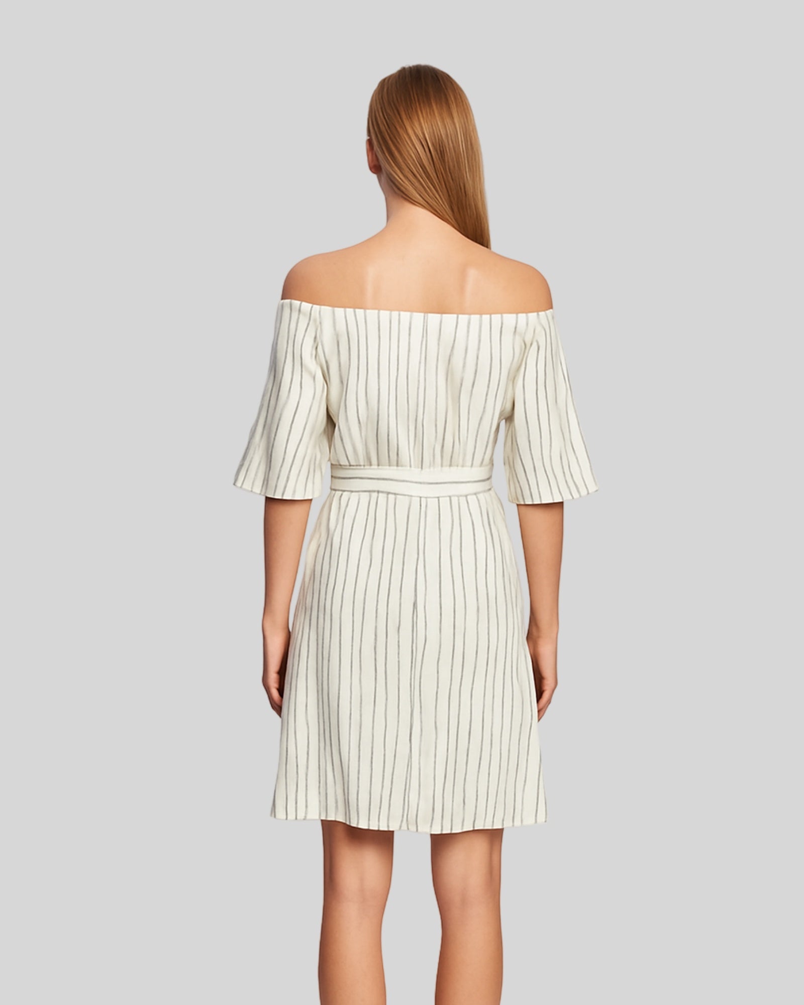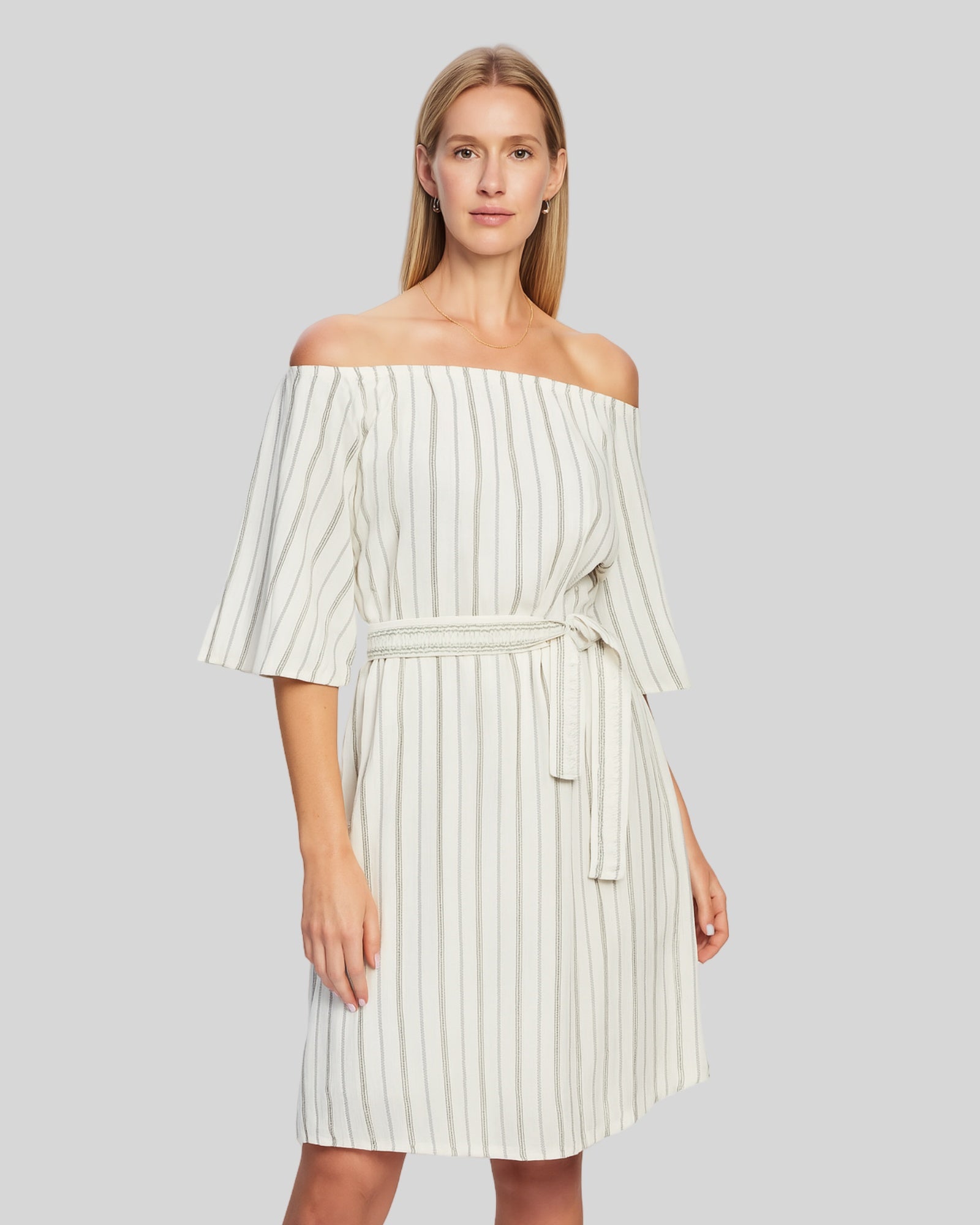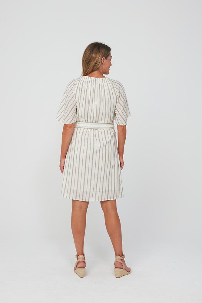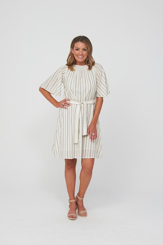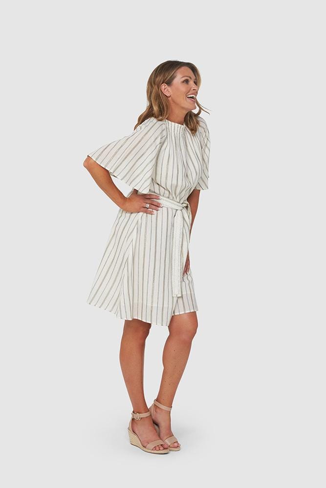 Whitney Dress is a beautiful and super-stylish Summer Dress crafted from 100% cotton with a fine stripe of gold lurex throughout. Styled with an intricate belt around the waist and elasticated detail around the high-neckline.