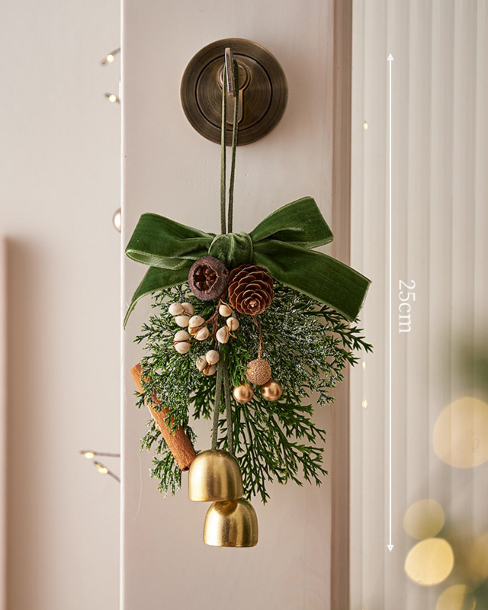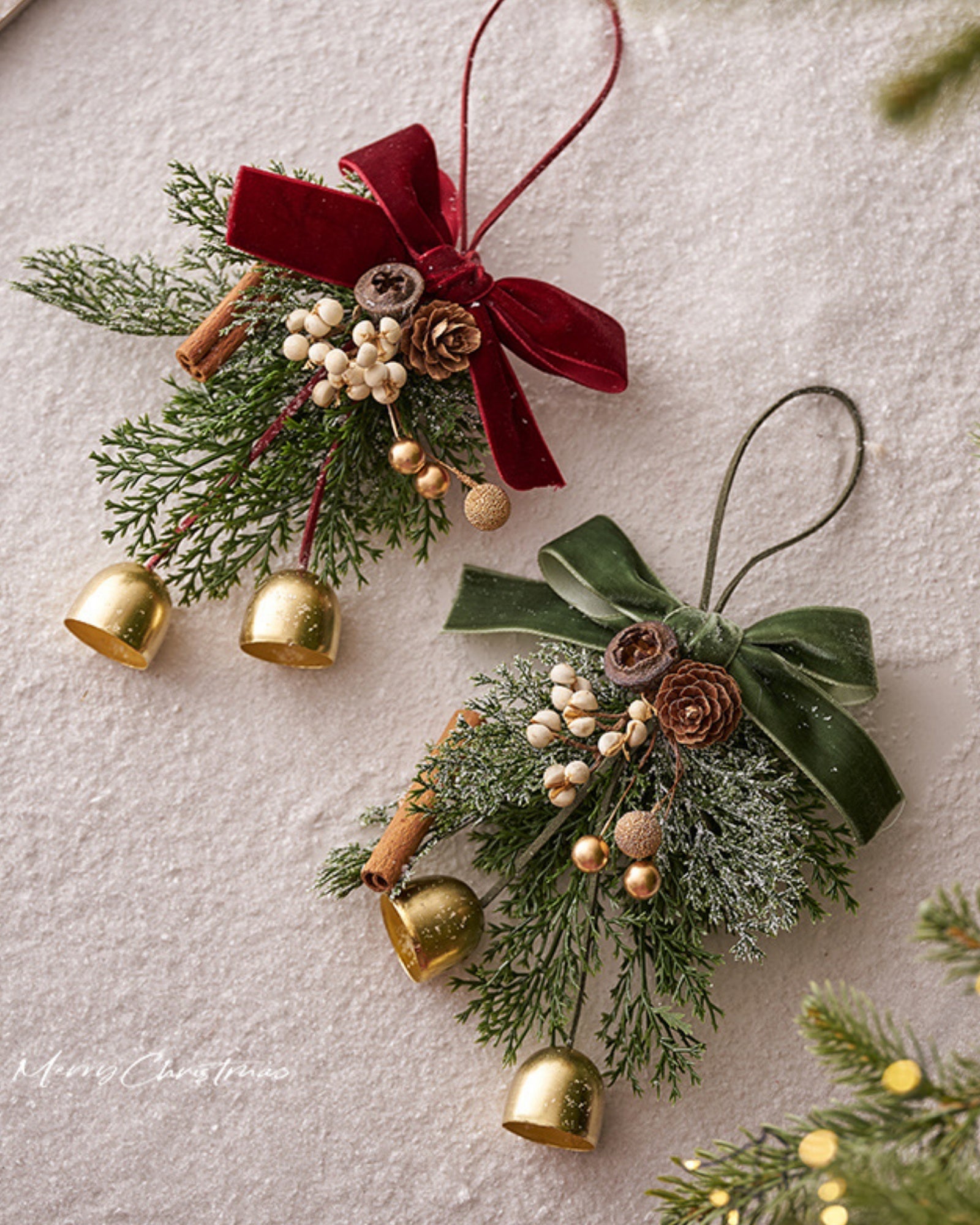 Handmade Christmas Hanging Ornaments with Pine Greenery & Golden Bells (2pcs)-Velvet Bell Duo